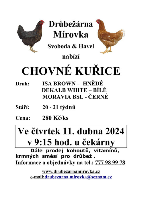 Úvod > Aktuality > Drůbežárna Mírovka prodává kuřice 11.4.2024 v 9.15 hod